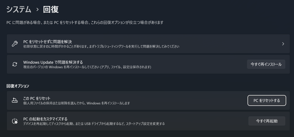 最終的にとった手法は「PCをリセットする」でした。ただし、先に「注意点:おそらくこれで解決できていたのでは?」を対応することで解決できていたかもしれません。
