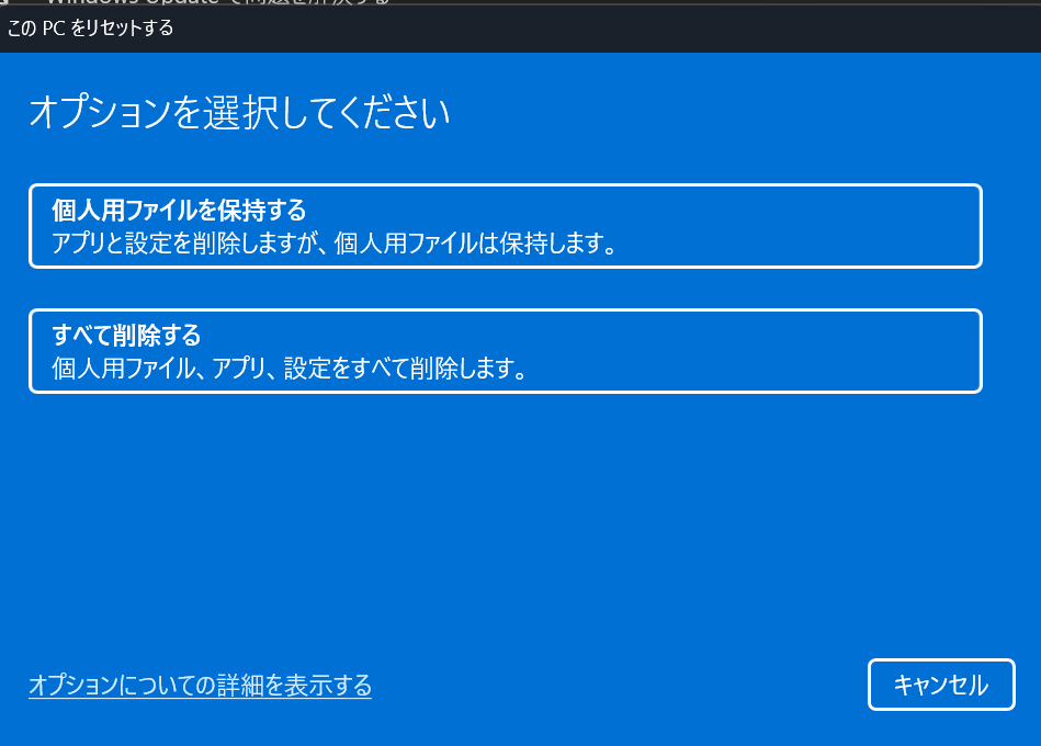 しかし、どの手法も解決できませんでした。最終的にはPCをリセットし、必要なファイルだけを移行することで解決しました。
